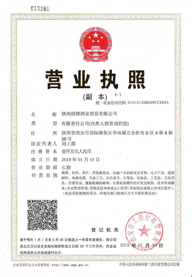 榮譽資質(zhì) 陜西國郡酒業(yè)營業(yè)執(zhí)照